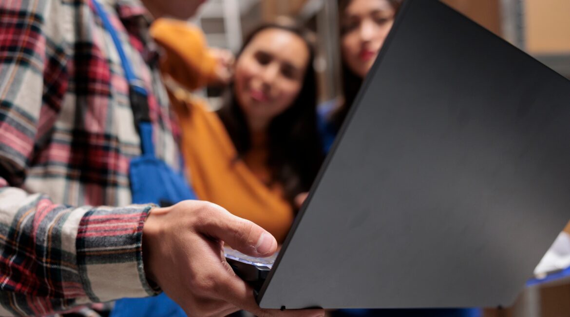 Warehouse manager showing coworkers inventory software on laptop